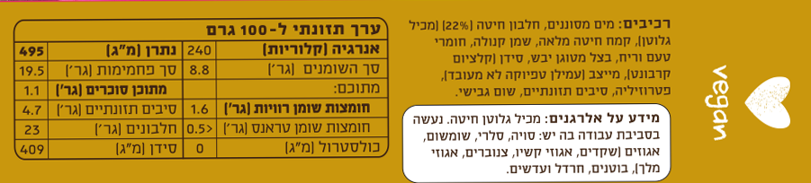רכיבים: מים, שמן קוקוס (23%), עמילנים מעובדים מתירס ותפוח אדמה, חלבוני סויה, מלח ים, מסמיכים (קריגינן, גומי גואר), תמצית שמרים, חומרי טעם וריח טבעיים, חומצה לקטית (לא ממקור חלב), צבע מאכל בטא קרוטן. מידע על אלרגניים: מכיל סויה. לשמור בקירור בטמפ' 1-8 מעלות, לאחר הפתיחה לשמור בכלי סגור ולצרוך תוך 10 ימים. כשרות: כשר פרווה בהשגחת בית דין לונדון ובאישור הרבנות הראשית לישראל. תכולה: 200 גרם.